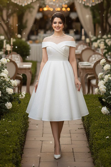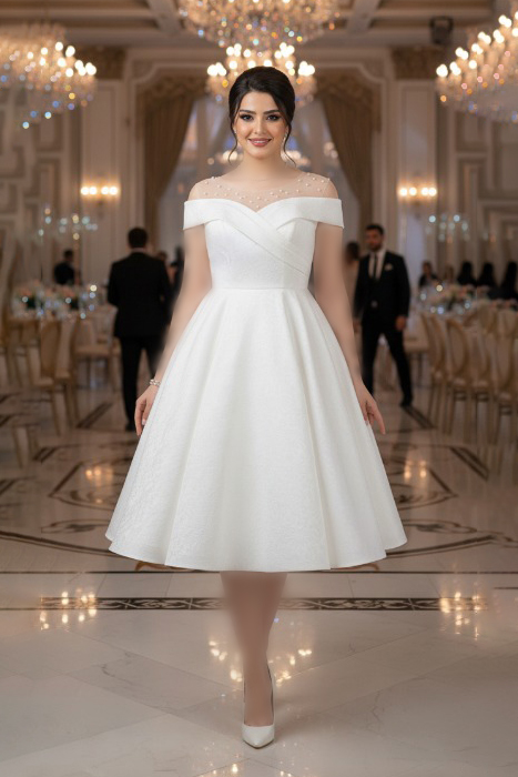 لباس مجلسی روشانا یکی از خاصترین انتخابها برای خانمهایی است که به دنبال لباسی شیک، زنانه و ماندگار هستند. این لباس مجلسی سفید کوتاه با طراحی یقه دکلته و افتاده (Off Shoulder)، جذابیتی کلاسیک و در عین حال مدرن دارد. جنس پارچه از کرپ ژاکارد با طرح ظریف است که علاوه بر ایستایی زیبا، جلوهای لوکس به لباس میبخشد.