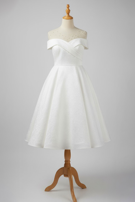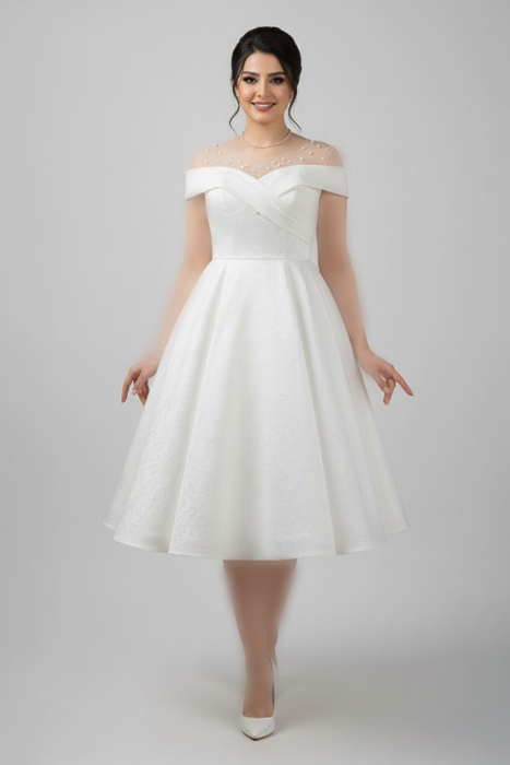طراحی: یقه افتاده (Off Shoulder) با تزئینات مرواریدی، فرم A-line تا روی زانو، استایلی کلاسیک و زنانه