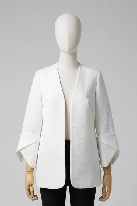 پارچه‌ی استفاده‌شده از کرپ برجسته طرح‌دار است که بافتی لطیف و فرمی ایستاده دارد. رنگ سفید خالص آن، جلوه‌ای لوکس و در عین حال ساده به استایل شما می‌بخشد و به‌راحتی با انواع شلوار یا دامن در رنگ‌های متنوع ست می‌شود.