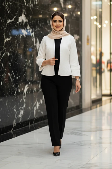 • طراحی: حاشیه‌دوزی با مروارید سفید در لبه جلویی کت و دور جیب‌ها، که جلوه‌ای کلاسیک و زنانه به آن داده است